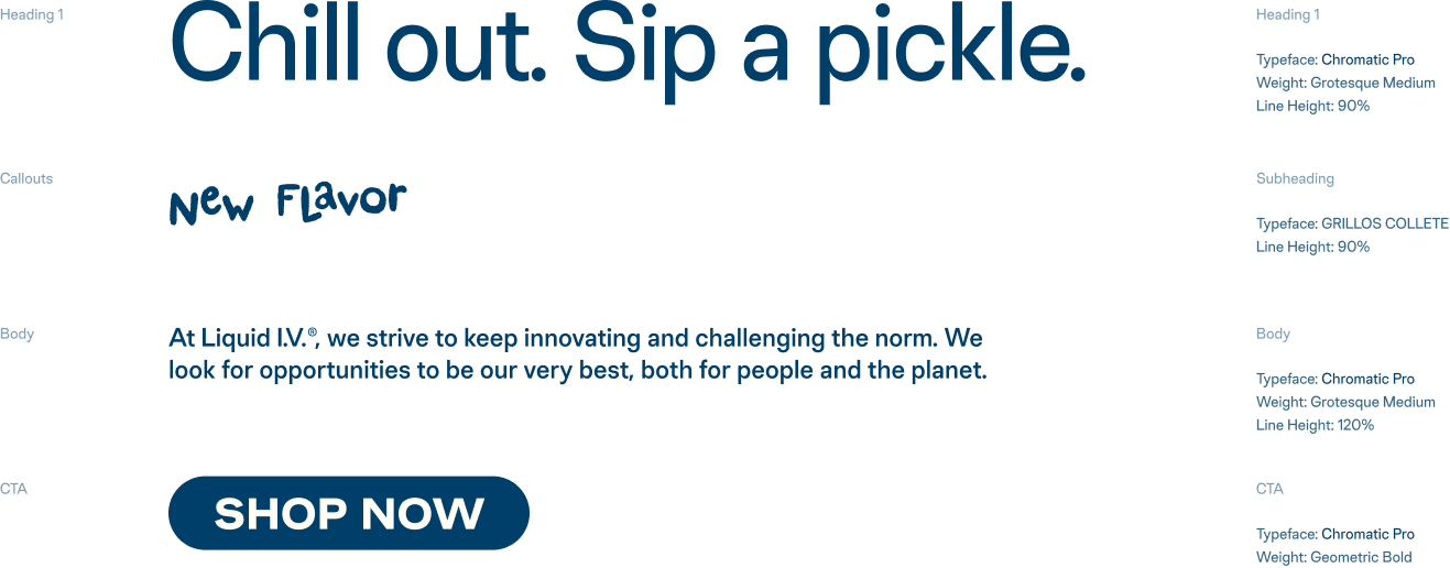 Our primary header font is Chromatic Pro, Liquid I.V.’s brand font. The font helps ground the sticker elements and bold photos bringing in a narrative thread. For callouts and special text, we used Grillo’s Collete, their original hand drawn font.